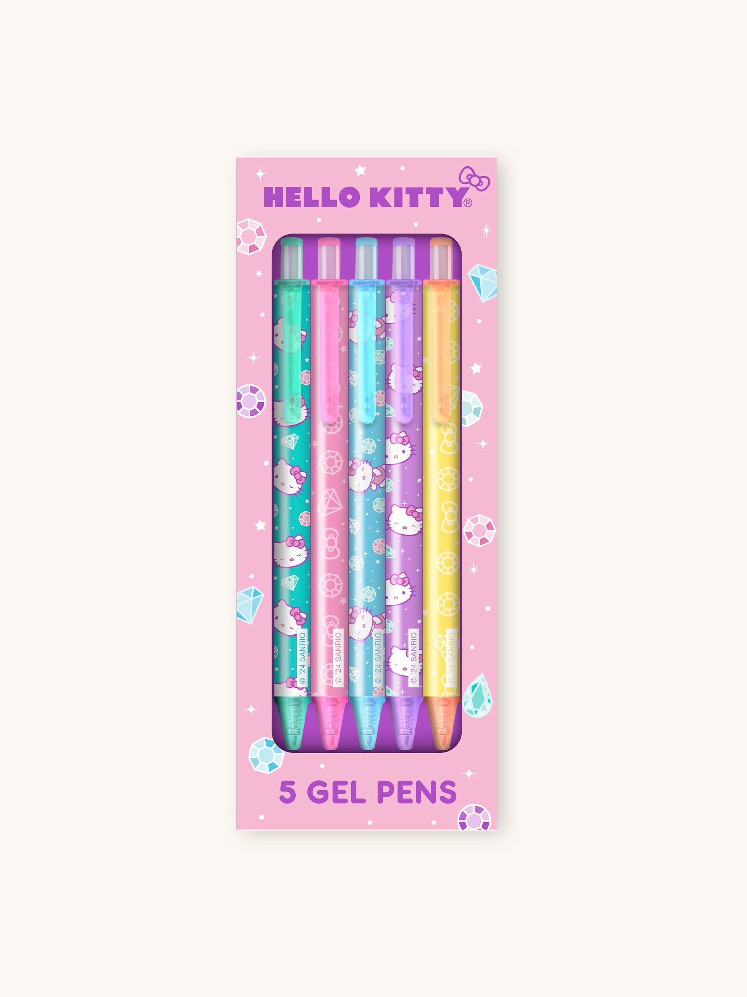 Unleash your imagination with our Hello Kitty –themed gel pens! This set features five cute, coordinating pens, each with a 0.7 mm tip for creating medium-thick lines. Pens come pre-filled with smooth-flowing ink in five vibrant colors. Whether you're taking notes, doodling, or planning your schedule, these pens are a playful addition to your writing tool kit. Perfect for back-to-school and beyond, this Hello Kitty gel pen set will infuse fun into every page.