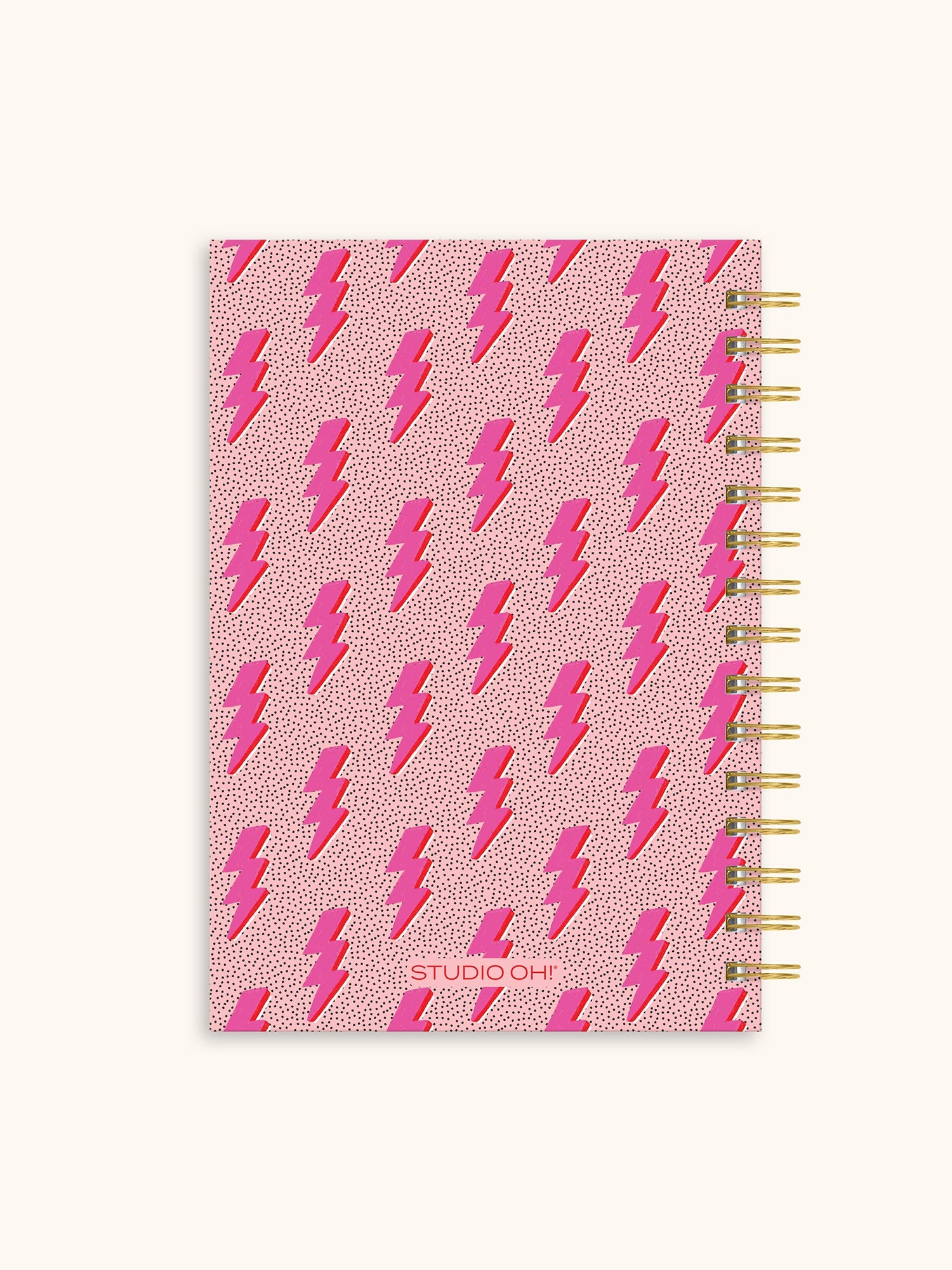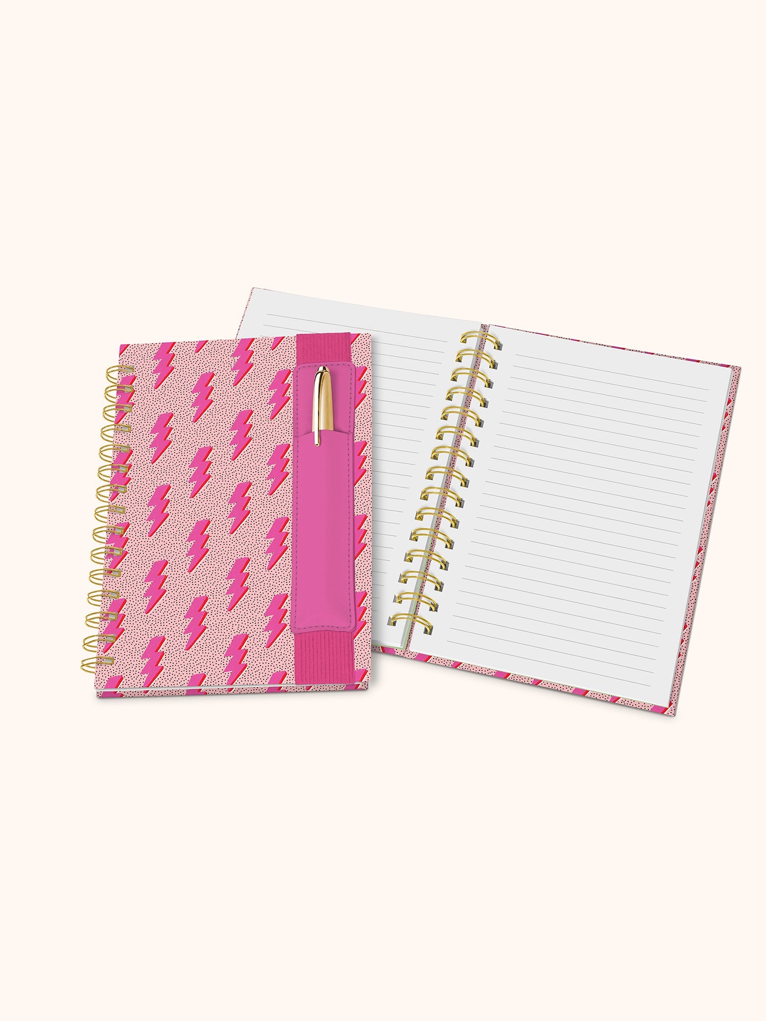 The Oliver Notebook comes with a convenient vegan leather pocket that securely holds two pens or pencils, and the wide elastic band can be used as a page marker. The hardcover format with wire-o binding provides writing support while allowing the pages to lie flat. Available in a selection of whimsical covers, the Oliver Notebook with Pen Pocket is designed to make journaling both fun and convenient for people on the go.