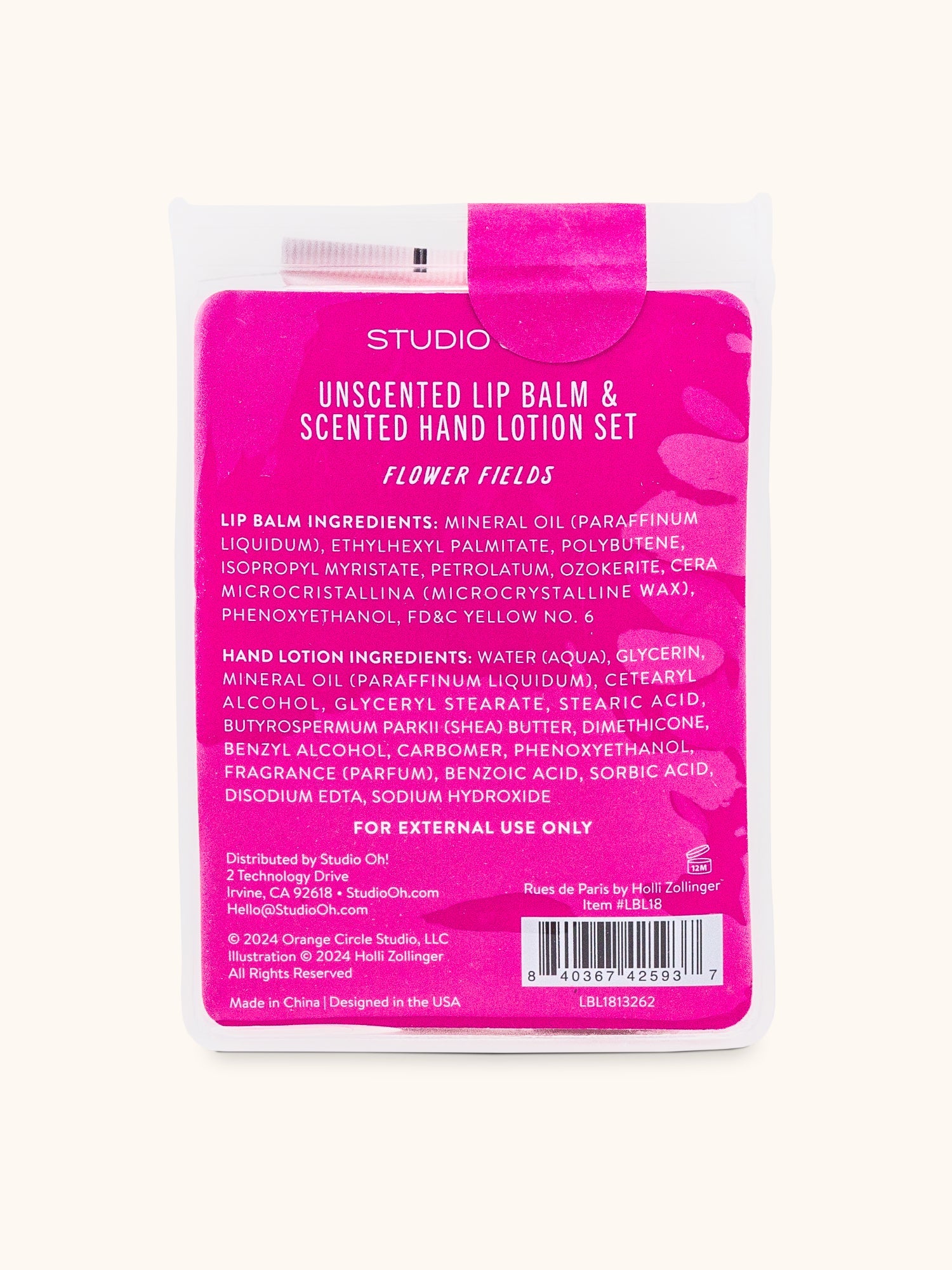 The Lip Balm & Hand Lotion Set from Studio Oh! includes a hand lotion and lip balm packaged in a clear, reusable pouch. The unscented lip balm helps gently moisturize and smooth dry lips, while the scented hand lotion hydrates hands and cuticles. The two-piece set is artfully designed and perfect for carrying in a handbag or gifting to a friend.
